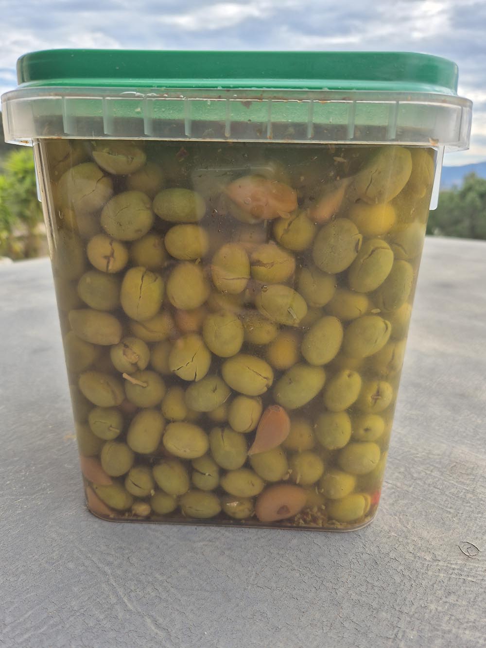 Aceitunas partidas naturales aliñadas con ajos, pimiento y especias. De sabor algo amargo y muy carnosas.