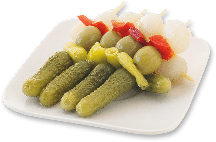 Las Banderillas son uno de los elaborados mixtos más típicos de los encurtidos. Son cinco encurtidos los que conforman esta exitosa mezcla de sabores: pepinillo crujiente, pimiento rojo troceado, cebollita, aceituna manzanilla deshuesada y troceado de guindilla picante. Se trata de un encurtido tradicional usado, sobre todo, como aperitivo. Su combinación de sabores hace de este producto un elemento imprescindible en cualquier mesa.